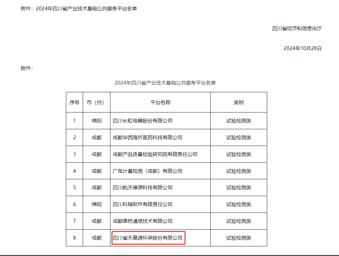 2024年四川省產(chǎn)業(yè)技術(shù)基礎(chǔ)公共服務(wù)平臺(tái)認(rèn)定工作四川省經(jīng)濟(jì)和信息化廳組織開展,經(jīng)過單位自主申報(bào)、市(州)審核推薦、專家評(píng)審、現(xiàn)場(chǎng)核驗(yàn)、公示等一系列嚴(yán)格程序,最終8家企業(yè)通過認(rèn)定。截至目前,全省共有23單位被認(rèn)定為四川省產(chǎn)業(yè)技術(shù)基礎(chǔ)公共服務(wù)平臺(tái),天晟源環(huán)保是其中唯一一家以環(huán)保為主業(yè)的入選單位。